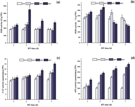 Changes in antioxidant enzyme activities in peony leaves under high temperature stress. (a) Superoxide dismutase (SOD); (b) ascorbic acid peroxidase (APX); (c) catalase (CAT); (d) peroxidase (POD). FW, fresh weight; different letters in the same column indicate significant differences at the 0.05 level.