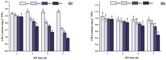 Changes in chlorophyll content of peony leaves under high temperature stress. (a) Chla content; (b) Chlb content. FW, fresh weight; different letters in the same column indicate significant differences at the 0.05 level.