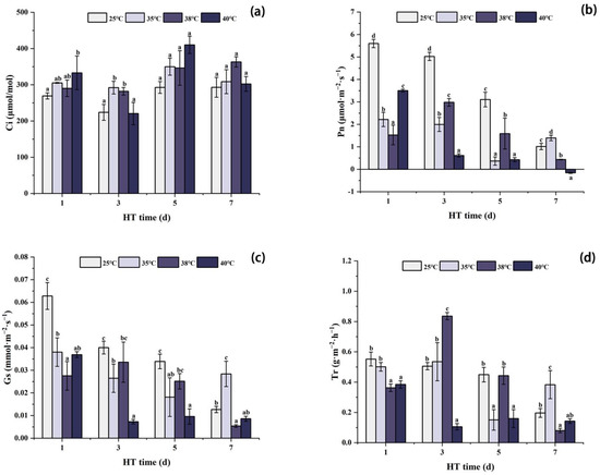 Changes in photosynthetic characteristics of peony leaves under high temperature stress. (a) Intercellular CO2 content (Ci); (b) net photosynthetic rate (Pn); (c) stomatal conductance (Gs); (d) transpiration rate (Tr). Different letters in the same column indicate significant differences at the 0.05 level.