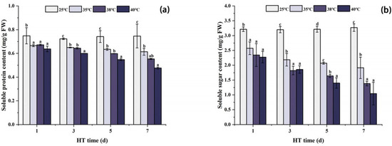 Changes in osmotic regulator content in peony leaves under high temperature stress. (a) Soluble protein content. (b) Soluble sugar content. FW, fresh weight; different letters in the same column indicate significant differences at the 0.05 level.