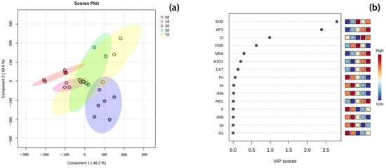 PLS-DA analysis and related VIP scores of various indices of peony leaves under high temperature stress at 40 °C for different stress days. (a) Score plot of PLS-DA analysis based on each value for different days of 40 °C stress. The different color spaces represent a separate group. (b) The score map of each physiological and biochemical index identified by VIP score; the physiological and biochemical index with a score greater than 1 has reference value. The indicator with the highest VIP score was the variable with the largest differential contribution in the model.