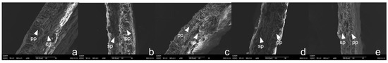 Scanning structure of leaves treated at 40 °C for different days. (a) Treatment at 40 °C for 0d; (b) treatment at 40 °C for 1d; (c) treatment at 40 °C for 3d; (d) treatment at 40 °C for 5d; (e) treatment at 40 °C for 7d; pp: palisade parenchyma; sp: spongy parenchyma.
