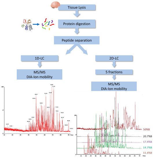 In order to characterize the protein content of DM, we employed a label-free liquid chromatography-mass spectrometry (LC-MS)-based proteomic approach using the ion mobility separation before peptide fragmentation. For further improving the coverage of the DM proteome, we evaluated the amount of protein identification using a single-dimension LC with a two-dimensional (2D) LC separation. Indeed, we applied 2D separation with a dilution approach to separate the peptide mixture in five fractions at high pH in the first dimension, before using dilution, trapping and separation at a low pH in the second dimension (Figure 1).