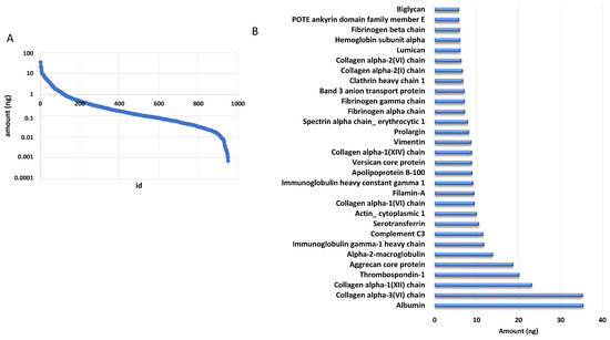 DM proteome distribution. (A) Distribution of protein amounts of all the identified proteins. (B) Distribution of the most abundant proteins.