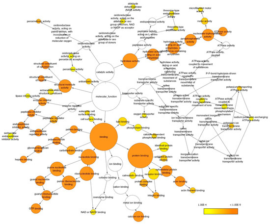 Gene ontology (GO) analysis in terms of the molecular function of all the identified proteins was performed with the Bingo plugin in Cytoscape (Figure 4) and revealed that most proteins are involved in binding functions, including protein-, nucleotide- and also lipid-binding. Another important represented category was hydrolase activity, including peptidase activity and nucleoside triphosphatase activity. Additionally, proteins endowed with structural activity, enzyme regulator activity, antioxidant activity and transporter activity have been identified, and found to be enriched (Supplementary Table S4).