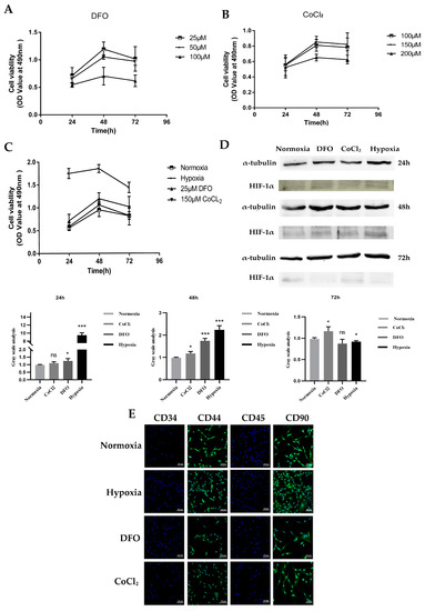 Establishment of a hypoxic microenvironment. (A) Effects of DFO at different concentrations on activity of ADSCs after 24, 48, and 72 h cultivation. N = 3. (B) Effects of different concentrations of CoCl2 on the activity of ADSCs after 24, 48, and 72 h cultivation. N = 3. (C) Activity of ADSCs cultured under 25 μM DFO, 150 μM CoCl2, normoxia, and physical hypoxia for 48 h. N = 3. (D) HIF-1α gene expression in ADSCs after 24, 48, and 72 h of treatment with different hypoxia methods. N = 3. (E) The expressions of cell surface markers CD34, CD44, CD45, and CD90 (scale: 100 μm) were detected using immunofluorescence after culturing ADSCs with 25 μM DFO, 150 μM CoCl2, and physical hypoxia for 48 h. * p > 0.05; *** p < 0.01; ns, not significant compared with ADSCs cultured under normal conditions. ADSCs, adipose mesenchymal stem cells; DFO, desferrioxamine.