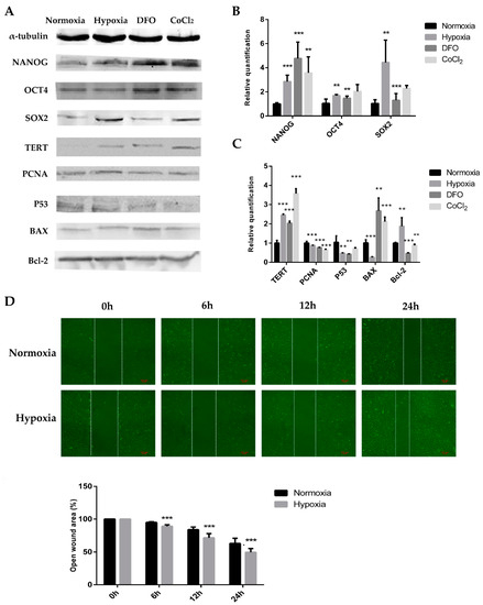 To investigate the effect of hypoxic culture on the function of adipose MSCs, we studied the expression of pluripotency genes. We observed that the expressions of NANOG, OCT4, and SOX2 were significantly higher following hypoxic culture conditions compared to those of ADSCs cultured in normoxia (Figure 2A,B). NANOG and OCT4 levels were elevated more significantly in the DFO and CoCl2 groups, and SOX2 levels were elevated more significantly in the physical hypoxia and CoCl2 groups. This indicates that hypoxic culture improved the pluripotency of stem ADSCs. The transcript and protein expressions of ADSC proliferation and apoptosis-related genes were also examined following hypoxic culturing in different ways. The telomerase reverse transcriptase (TERT) expression increased in the hypoxia treatment groups, whereas proliferating cell nuclear antigen (PCNA) expression increased in the physical hypoxia group and decreased in the DFO and CoCl2 groups. P53 expression decreased in the hypoxia treatment groups, BAX expression decreased in the physical hypoxia group and increased in the DFO and CoCl2 groups, and Bcl-2 expression increased in the physical hypoxia group and decreased in the DFO and CoCl2 groups (Figure 2A,C). The Bcl-2/BAX ratio increased in the physical hypoxia group, both at the transcriptional and protein levels. The decrease in p53 expression and increase in the Bcl-2/BAX ratio further demonstrated the promotion of the hypoxic microenvironment on ADSC proliferation. Since the physical hypoxic approach had a greater effect on anti-apoptosis, subsequent studies on the effect of the hypoxic microenvironment on the cell function of ADSCs were performed under the physical hypoxic approach.