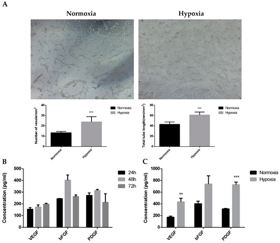 The area between the cell scratches gradually decreased after 6, 12, and 24 h. The ratio of the scratch area to the starting area of ADSCs was always smaller after hypoxic culture than after normoxic culture, and the difference was significant after 24 h (Figure 2D). This confirmed that the migration ability of the cells was stronger after hypoxic culturing. Thus, the hypoxic microenvironment stimulated ADSC migration. The angiogenesis assay results revealed that the number and length of blood vessels per unit area were significantly higher in ADSCs after hypoxic culture than after untreated normoxic culture (Figure 3A). Conditioned media were collected from normoxic (Nor-cm) cultured ADSCs for 24, 48, and 72 h, and the expression of growth factors was detected via ELISA. The expressions of growth factors VEGF, bFGF, and PDGF were higher in the conditioned medium at 48 h; therefore, 48 h was used as the final collection time (Figure 3B). Conditioned media from the physically hypoxic cultured (Hypo-cm) ADSC at 48 h was collected, and the concentration of growth factors was examined. The concentrations of VEGF, bFGF, and PDGF were higher in Hypo-cm than in Nor-cm ADSCs (Figure 3C).
