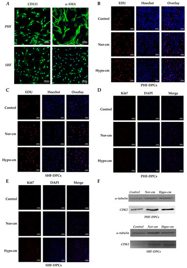 PHF-DPCs and SHF-DPCs were inoculated into 4-well plates containing 2.5 × 104 cells/well and cultured in Hypo-cm and Nor-cm conditioned media, respectively, using cells in untreated culture medium as the control. Cells were treated according to the instructions of the EdU cell proliferation assay kit (Reebok Apollo567). Briefly, 100 μL of 50 μM EdU medium were added to each well, and the plate was incubated for 2 h. The medium was discarded, 100 μL PBS was added, and the plate was shaken for 5 min. Then, 50 μL of 4% paraformaldehyde was added to fix at room temperature for 30 min; then, the paraformaldehyde was discarded. Additionally, 50 μL of 2 mg/mL glycine was added, and the plate was shaken for 5 min. The glycine was discarded, 100 μL PBS were added, and the plate was shaken for 5 min. Moreover, 100 μL of 1× Apollo staining solution was added to each well. Then, the plate was incubated for 30 min at room temperature protected from light. The staining solution was discarded, and 100 μL of 0.5% TritonX-100 was added. The plate was shaken 2–3 times for 10 min each time, and the permeate was discarded. Next, 100 μL 1× Hoechst33342 reaction solution was added, and the plate incubates for 30 min at room temperature and protected from light. Finally, the cells were washed 1–2 times with PBS, and the laser confocal microscope was used to take pictures after the staining was complete to observe cell proliferation.