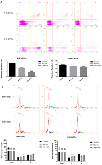 Conditioned medium for ADSCs enhances proliferation and induces follicle formation in DPCs. (A) Apoptosis was detected with flow cytometry. PHF-DPCs and SHF-DPCs were cultured for 48 h in Hypo-cm and Nor-cm and stained with Annexin V-FITC/PI to detect apoptosis. PHF-DPCs and SHF-DPCs were cultured for 48 h in Hypo-cm and Nor-cm. Distribution of apoptotic cells. N = 3. (B) Cell cycle was detected with flow cytometry. PHF-DPCs and SHF-DPCs were cultured in Hypo-cm and Nor-cm for 48 h, and PI staining was performed to determine the histogram distribution of each phase of the cell cycle. Number of cells in G0/G1, S, and M phases of PHF-DPCs and SHF-DPCs cultured for 48 h in Hypo-cm and Nor-cm. N = 3. ** 0.01 < p < 0.05; *** p < 0.01 compared with ADSCs cultured under normal conditions.