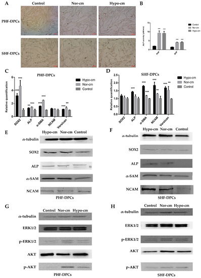 Conditioned medium for ADSCs enhances proliferation and induces follicle formation in DPCs. (A) ALP staining of PHF-DPCs and SHF-DPCs cultured for 48 h in Hypo-cm and Nor-cm (scale: 100 μm). N = 3. (B) ALP activity detection in PHF-DPCs and SHF-DPCs cultured in Hypo-cm and Nor-cm for 48 h. N = 3. (C,D) qRT-PCR results showing the transcription of specific marker genes SOX2, ALP, α-SMA, NCAM, and versican in PHF-DPCs and SHF-DPCs cultured for 48 h in Hypo-cm and Nor-cm. N = 3. (E,F) Western blot results showing the expressions of specific marker genes SOX2, ALP, α-SMA, and NCAM in PHF-DPCs and SHF-DPCs cultured for 48 h in Hypo-cm and Nor-cm. N = 3. (G,H) Western blot was used to detect activation of AKT and ERK signaling pathways in PHF-DPCs and SHF-DPCs cultured in Hypo-cm and Nor-cm. N = 3. ** 0.01 < p < 0.05; *** p < 0.01 compared with ADSCs cultured under normal conditions.