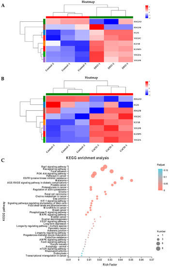 The ERK1/2 and HIF-1α signaling pathways regulate paracrine levels in ADSCs in a hypoxic microenvironment. (A) “DFO vs. control”, and (B) “CoCl2 vs. control” heatmap of the eight growth factor genes identified in the expression analysis table. Up-regulated (red) and down-regulated (blue) genes are shown as log2 (fold change) in hypoxia-treated and control groups. (C) KEGG enrichment bubble plots for the nine growth factor genes identified in the expression profile analysis table. KEGG, Kyoto Encyclopedia of Genes and Genomes.