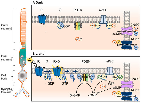 Cyclic guanosine 3′, 5′-monophosphate (cGMP) acts as a second messenger molecule in almost all cell types by activating the cGMP-dependent protein kinase G (PKG) and regulating various cellular activities. In photoreceptors, besides acting as a second messenger, cGMP plays a pivotal role in phototransduction by governing the cyclic nucleotide-gated (CNG) channels. In darkness, CNG channels are kept open by the binding of cGMP, maintaining a steady Ca2+ and Na+ influx. Upon light stimulation, the light-sensing protein rhodopsin/opsin undergoes a conformational rearrangement, which activates the heterotrimeric G protein transducin. Consequently, the α subunit of transducin activates phosphodiesterase 6 (PDE6), leading to the catalytic acceleration of cGMP hydrolysis, closure of the channels, and the hyperpolarization of the cell [,,,,] (Figure 1). Phototransduction follows the same cascade in both rods and cones, even though the components involved in the cascade vary in the two types of the photoreceptors. For example, the rod CNG channel is composed of CNGA1 and CNGB1 subunits, whereas the cone CNG channel is composed of CNGA3 and CNGB3 [,]. The rod PDE6 is composed of PDE6α, PDE6β, and PDE6γ subunits, whereas the cone PDE6 is composed of the PDE6α’ and PDE6γ’ subunits [,].