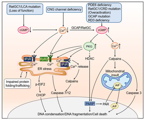 The cellular and molecular mechanisms underlying cGMP signaling-induced photoreceptor degeneration. Overactivation of RetGC/GCAP or deficiency of PDE6 leads to the accumulation of cGMP and the subsequent intracellular Ca2+ overload. Deficiency of RD3 leads to the aberrant activation of the RetGC/GCAP complex in the inner segment, leading to excessive cGMP production. Deficiency of the CNG channel leads to a reduced intracellular Ca2+ level and the subsequent accumulation of cGMP via the Ca2+/Mg2+-GCAP/RetGC complex. The deficiency of RetGC/GCAP leads to reduced cellular cGMP and [Ca2+]i. The elevated cGMP/PKG signaling and impaired Ca2+ homeostasis lead to cellular stress/death. The elevated cGMP/PKG signaling induces ER stress, leading to cell death via the activation of CHOP and caspase-7/12. Along with a reduced cellular Ca2+ level, it causes ER Ca2+ dysregulation by activating the IP3R1 and RyR2 channels and promoting the release of Ca2+ from the ER. The activated cGMP/PKG signaling may also induce HDAC and PARP, leading to cellular stress/cell death, directly and via the release of AIF from the mitochondria. The elevated cGMP/Ca2+/calpain signaling induces cellular stress/death by activating caspases, releasing AIF from the mitochondria, and stimulating PARP.