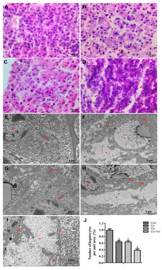 Effect of copper sulfate and trichlorfon on the liver of zebrafish on the 21st day. (A–D) Liver tissue paraffin sections; (A) Con; (B) Cu; (C) Tri; (D) Cu + Tri. (E–H) Liver tissue transparent electron microscopy; (E) Con; (F) Cu; (G) Tri; (H,I) Cu + Tri. (J) Relative number of hepatocytes per unit area of the hepatic slice. Bars indicate mean ± SD (n = 3). * indicates p < 0.05. The arrow indicates the gap between hepatocytes. * indicates autophagolysosome; triangle indicates intracellular vacuoles; N: nucleus; M: mitochondria; ER: endoplasmic reticulum.