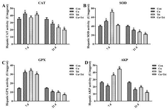 As depicted in Figure 2, on the seventh day, the CAT, SOD, and GPX activities were up-regulated significantly by 20.76%, 27.54%, and 124.93%, respectively, while the AKP activity was down-regulated significantly by 18.46% in the Cu group compared to the control group. When administered alone, Tri significantly increased the activities of the SOD, GPX, and AKP by 78.05%, 137.11%, and 38.18%, respectively, whereas the combination of copper sulfate and Tri significantly increased the activities of the CAT, GPX, and AKP by 17.01%, 109.87%, and 72.0%, respectively. On day 21, all three treatment groups exhibited significantly lower CAT, SOD, GPX, and AKP activities compared to the control group.