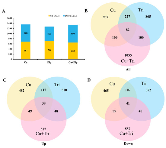 (A) Transcriptome sequencing analysis of number of DEGs in three treatment groups compared to the control. (B–D) Venn analysis for DEGs.