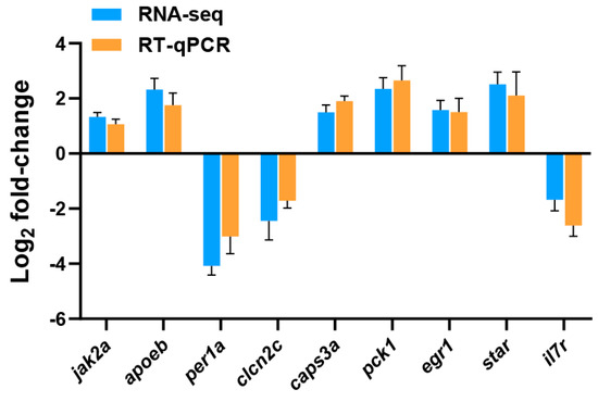 In the present study, transcriptome sequencing was employed to uncover substantial alterations in the expression of zebrafish liver genes induced by copper sulfate and Tri, either alone or in combination. As illustrated in Figure 3, 687 and 668 genes were significantly up-regulated and down-regulated, respectively, in the Cu group, while 714 and 560 genes were up-regulated and down-regulated, respectively, in the Tri group. Similarly, 653 and 693 genes were up-regulated and down-regulated, respectively, in the Cu + Tri group. A Venn analysis revealed that 39 and 41 genes were significantly up-regulated and down-regulated, respectively, across all three treatment groups. Nine DEGs selected at random from the transcriptome findings were subjected to RT-qPCR to validate the RNA-seq outcomes. The results indicate that the changes in these genes were consistent with both the RT-qPCR and RNA-seq, thus indicating the reliability of the transcriptome results (shown in Figure 4). The red region indicates the up-regulation of genes, and the blue region indicates the down-regulation of genes in the heatmap analysis (shown in Figure 5).