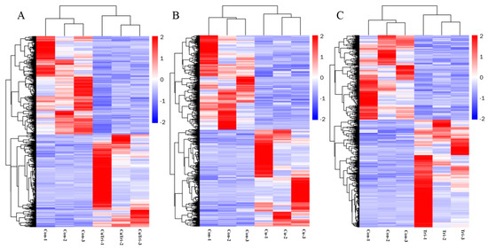 Heatmap analysis (columns represent samples, and rows represent genes. The red region indicates up-regulation of genes, and the blue region indicates down-regulation of genes). (A) Comparison between control and copper sulfate + trichlorfon group. (B) Comparison between control and copper sulfate group. (C) Comparison between control and trichlorfon group.