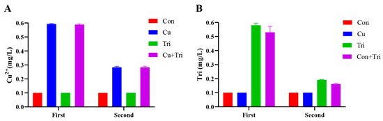 Actual Cu2+ and trichlorfon concentration in water samples. (A) represents the concentration of copper ions. (B) represents the concentration of trichlorfon. The first measurement refers to the initial determination of copper sulfate and trichlorfon concentrations immediately after adding them to the water. The second measurement refers to the determination of concentrations prior to changing the water for the experiment.