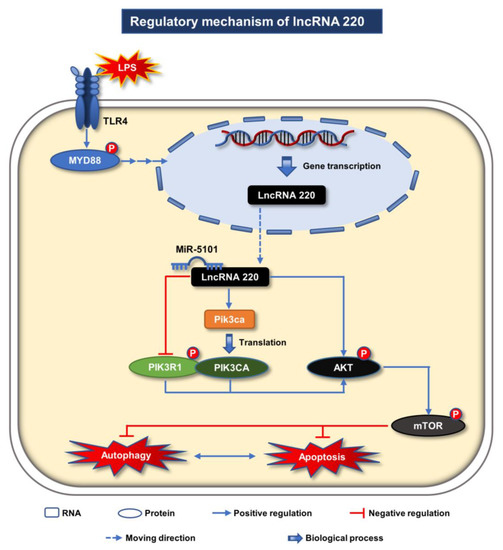Yang Y, Tian T, Li S, Li N, Luo H, Jiang Y. LncRNA 220: A Novel Long Non-Coding RNA Regulates Autophagy and Apoptosis in Kupffer Cells via the miR-5101/PI3K/AKT/mTOR Axis in LPS-Induced Endotoxemic Liver Injury in Mice. International Journal of Molecular Sciences. 2023; 24(13):11210. https://doi.org/10.3390/ijms241311210