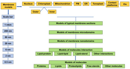 61]; this is reflected in the structure and features of membranes. It would be appropriate to study each individual membrane based on the molar content of all its components and to construct a model of the membrane either in 2D or in 3D. A suggestion could be made to register the findings not only in scientific articles, but also using some kind of common platform. Thus, it would be very useful to create a database and a kind of “biomembrane encyclopaedia”, similar to what has already been created for genes and the genome, called KEGG (Kyoto Encyclopaedia of Genes and Genomes). Different models of individual cell organelles or their characteristic regions should be collected and represented in this database, as far as possible, within the range from 200 nm to 0.5 nm. Models of artificial membranes may also be represented in this database. This database should also include modelling data for individual molecules of compounds making up membranes, such as PL, sterols, proteins, etc. Most importantly, the data will be concentrated in one place and be easily accessible. We believe that the creation of this platform will advance the study of the membranes of all eukaryotes.