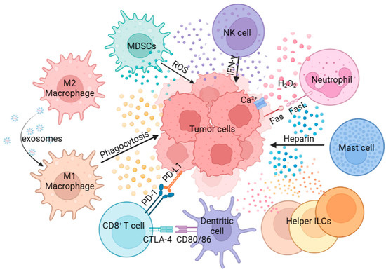 NK cells are cytotoxic lymphocytes that hold the capacity to kill cancerous cells. In general, NK cells can kill tumor cells via direct cytotoxicity and pro-inflammatory cytokines production [24]. “Missing-self” is one mechanism of direct cytotoxicity. Immunoreceptor tyrosine-based inhibitory motifs (ITIMs) can engage with the major histocompatibility complex-I (MHC-I) to stop NK cells from destroying ordinary cells, which means NK cell activation can be inhibited by the binding of MHC-I. However, tumor cells always lack or only very faintly express MHC-I in order to escape CD8+ T cell-mediated cytotoxicity. Thus, NK cells can recognize and reply to this missing-self phenotype [49]. ADCC is another crucial mechanism of NK cell-mediated direct cytotoxicity [24]. Additionally, NK cells express significant quantities of IFN-γ and TNF. They can not only enhance cytotoxic CD8+ T cell response, but also can they suppress the proliferation and angiogenesis of tumor cells while they promote the apoptosis of cancerous cells [50].