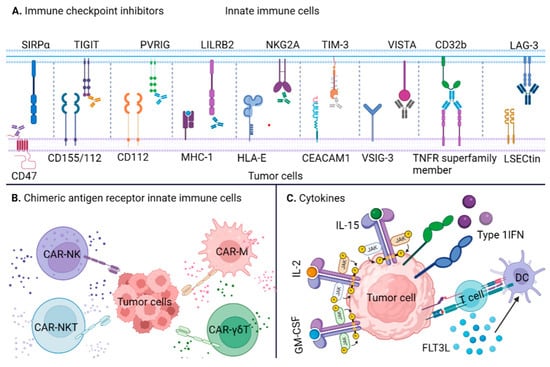 Current immunotherapies including ICIs, cell therapies and tumor vaccines, present potent antitumor efficiency [79,80,81]. Through disrupting the immune checkpoint pathway, ICIs have become the most widely used agents in cancer immunotherapy [82]. CAR T cell therapy was developed from adoptive T cell transfer, which typically modifies and redirects patients’ own T cells to recognize and kill tumor cells. Recently, CAR-T cell therapy has achieved notable success in the treatment of hematologic malignancies [79]. Through inducing APC cell-mediated immune responses, tumor vaccines could be designed to eradicate malignant cells [83]. Recently, immunotherapies based on innate immune cells have emerged, including innate ICIs, CAR innate immune cells and cytokine therapy. Innate ICIs achieve anti-tumor purposes by targeting checkpoints such as SIRPα, TIGIT, PVRIG, LILRB2, NKG2A, LAG-3, TIM-3, VISTA and CD32B (Table 1; Figure 2A) [84]. NK cells, NKT cells, γδT cells and macrophages engineered with CAR may be redirected effectively towards specific antigens (Table 1; Figure 2B) [85]. GM-CSF, type I IFNs, FLT3L, IL-2 and IL-15 can promote the development and proliferation of APCs as well as the activation of NK cells (Table 2; Figure 2C) [86].