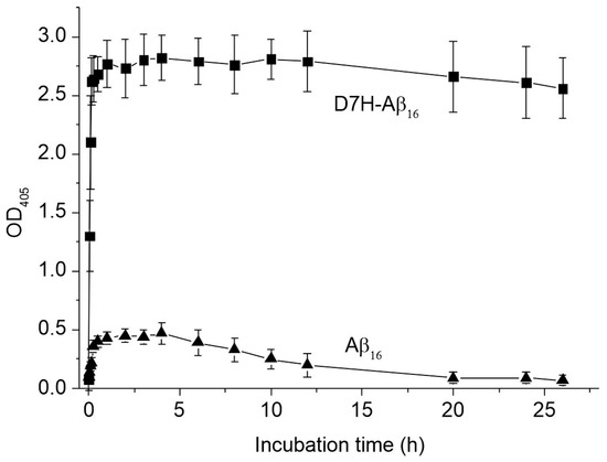 Turbidity measurements is one of the classic methods for assessing the aggregate state of amyloid-beta peptides and their fragments under various experimental conditions [33]. Turbidimetry was used for a comparative assessment of the aggregation state of 1 mM aqueous solutions of D7H-Aβ16 and Aβ16. The measurements were conducted in the presence of equimolar amounts of zinc ions in order to identify the integral differences in the aggregation ability of these peptides and their zinc complexes. In the absence of zinc ions, there was no change in the turbidity of the peptides D7H-Aβ16 and Aβ16 solutions for at least 2 h. The addition of Zn2+ to D7H-Aβ16 triggered a rapid peptide aggregation, manifested by a rise in the solution turbidity (Figure 1). The maximal turbidity of the Aβ16 solution in the presence of Zn2+ was 5–6 times lower than for D7H-Aβ16. The turbidity signal of D7H-Aβ16 was stable for 26 h after the addition of ZnCl2. In contrast, within the same timeframe, the turbidity of the Aβ16 solution decreased by 6–8 times. These data indicate that after the addition of zinc ions to Aβ16, zinc-bound monomeric complexes Zn/Aβ16 are formed, together with a minor fraction of metastable oligomers, which subsequently decompose to the corresponding monomers within a 26 h period. In the absence of zinc ions, for free D7H-Aβ16, the turbidity signal practically corresponds to that of Aβ16, confirming the monomeric status of D7H-Aβ16 under these conditions. The addition of zinc ions to the D7H-Aβ16 solution did not lead to the precipitation of the peptide, as evidenced by a stable turbidity value over time.