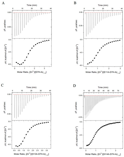 ITC titration curve (upper panel) and the binding isotherm (lower panel) for Zn2+ (5 mM) interaction with 0.3 mM D7H-Aβ16 (A), E11A-D7H-Aβ16 (B), H13A-D7H-Aβ16 (C), H14A-D7H-Aβ16 (D) at 25 °C in 50 mM Tris buffer, pH 7.3.