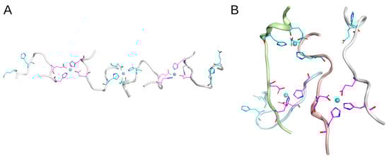 The MD modeling presented in the previous section showed the variability and flexibility of the structures that grow due to zinc ions located in the coordination centers of D7H-Aβ16 peptides. The position of the residues 6 and 7 is critically important for the structure of the resulting complexes as it bears upon the activation of the zinc binding site that involves H13. In the Aβ16 peptide, the metal binding site H6/H13 is not present. The D7H mutation provides a new zinc ion coordination center, H7/H13. At the same time, the isomerization of the D7 residue rotates the N-terminus of the Aβ16 peptide and enables a coordination center, H6/H13, for the zinc ion [21]. We speculate that the D7H and isoD7 modifications can emerge in the population of Aβ16 and become the seeds of rapid aggregation through zinc binding interfaces created by an additional metal binding site in D7H-Aβ16 and isoD7-Aβ16, in contrast to Aβ16. To explore this possible mechanism in more detail, we created two systems of peptide trimers (Figure 11) bound through zinc ions.