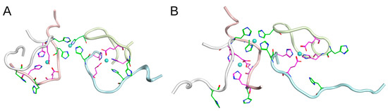Molecular modelling employing Molecular Dynamics (MD) was used to analyze the structure patterns of the zinc-induced oligomers of D7H-Aβ16 at the initial stages of aggregation. Trajectory analysis of the 200 ns MD modeling of the D7H-Aβ16 dimer bound through the E11/H14:ZN:E11/H14 interface was applied to select the preferable combinations of amino acid residues from the initial set—obtained according to the MS data (Section 2.3)—involved in the chelation of the shared zinc ions inside the zinc-induced oligomers of D7H-Aβ16. We conducted both clustering and distance calculations for the pairs of the residues E3, H6, H7, and H13 for each molecule over all frames of the MD trajectory to determine the preferred conformations of the D7H-Aβ16 dimer. The analysis showed that residues E3 and H13 over the whole 200 ns MD modeling time never appear within at least a 4.5 Å range from each other. Therefore, the interface based on the E3/H13 and H6/H7 pairs was excluded from the modeling in this study. However, we cannot dismiss the possibility that this interface could emerge in more complex systems with a higher number of molecules than that examined in this study. In the interface based on the pairs E3/H6 and H7/H13, an antiparallel arrangement of the 11-EVHH-14 sites in the peptides brings residues H6/H7 and H13 of the peptides in the dimer close to each other. Pair H7/H13 appeared in 36 frames of 20,000 and pair H6/H13 in 3 frames. Residues E3/H6 and E3/H7 were spatially close to each other in 253 and 2141 frames, respectively. However, pairs E3/H7 and H6/H13 are unlikely to exist concurrently in the same molecule due to steric clashes and were not taken into account here. Overall, the MD modeling showed that the most likely interaction interfaces for the zinc-induced oligomerization of D7H-Aβ16 are E11/H14:ZN:E11/H14, E3/H6:ZN:E3/H6, and H7/H13:ZN:H7/H13.