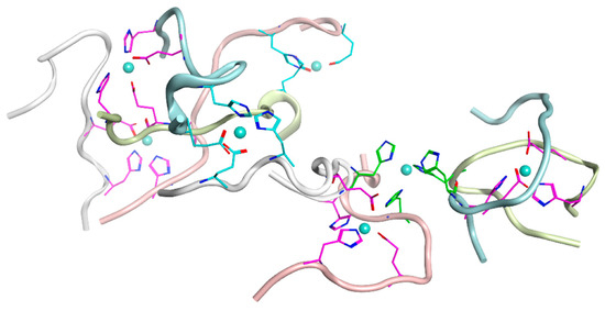 As shown in Figure 10, the proposed equilibrium structure of the D7H-Aβ16 dodecamer has three polymerization seeds and can be easily extended for further polymerization. This is possible due to the presence of a third interface—H7/H13:ZN:H7/H13—in the D7H-Aβ16 molecule available for binding a Zn atom, while Aβ16 has only two interfaces. The alternation of different zinc coordination interfaces likely creates more stable and strongly bound structures of aggregates as there is a greater number of intermolecular bonds in such systems compared to simple stacking, such as in the aggregate shown in Figure 7.