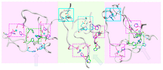 Dodecamer constructed with D7H-Aβ16 peptides with interlacing E3/H6:ZN:E3/H6, E11/H14:ZN:E11/H14 and H7/H13:ZN:H7/H13 interfaces between peptides after 50 ns of MD. Residues Glu11 and His14 are colored with magenta. Residue His7 and His13 are colored with green. Residue Glu3 and His6 are colored with cyan. The system was built of three tetramers highlighted with pink for tetramers with the H7/H13:ZN:H7/H13 interface and yellow for tetramer with the E3/H6:ZN:E3/H6 interface. Interaction interfaces are highlighted with dotted squares for the internal interactions inside each tetramer and with solid line squares for interactions between tetramers. The potential seeds for polymerization are shown with arrows.