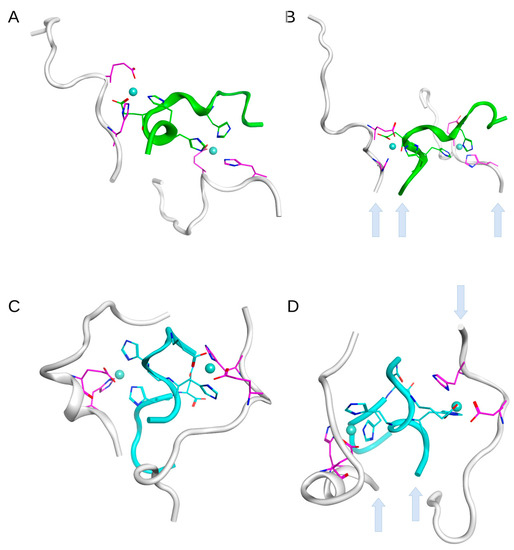 Equilibrium conformations of the trimers formed by D7H-Aβ16 (colored with green) with two standard Aβ16 peptides (A,B) and isoD7-Aβ16 (colored with cyan) with two standard Aβ16 peptides (C,D) obtained after 100 ns of MD. (A) interaction interface between D7H-Aβ16 and two standard Aβ16 peptides bound via Zn ions. Zn ions are coordinated with Glu11 and His14 residues of the standard Aβ16 peptides (colored with magenta) and with residues His7, His13 and Glu11, His14 of the D7H-Aβ16 peptide. (B)—different view on the complex presented in (A). C-termini are shown with arrows. (C) interaction interface between the isoD7-Aβ16 and two standard Aβ16 peptides bound via Zn ions. Zn ions are coordinated with Glu11 and His14 residues of the standard Aβ16 peptides (colored with magenta) and with residues His6, His13 and Glu11, His14 of the isoD7-Aβ16 peptide. (D) different view on the complex presented in (C). C-termini are shown with arrows.