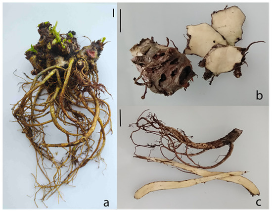 The plants were harvested at the end of the growing season (5th year of cultivation—30 September 2021, 6–10 October 2022). Rhizomes and roots were washed, then the roots were separated from rhizomes and cut into pieces (maximum thickness of 1 cm) (Figure 1). The roots and rhizomes were not cleansed of periderm. Dry weights of roots and rhizomes were recorded for each plant after drying to constant weight via warm-air ventilation at 45 °C. Dry samples were stored in paper bags under dark dry conditions at 20–22 °C.