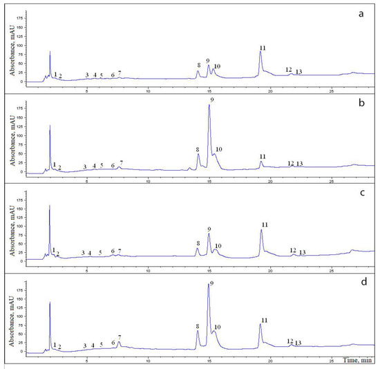 Chromatograms of an aqueous–ethanol extract of the rhizomes (a,b) and roots (c,d) of specimens No. 1 (a,c) and No. 4 (b,d) of R. rosea. The numbers in the chromatogram denote ID numbers of compounds corresponding to the ID numbers of compounds in Table 2.
