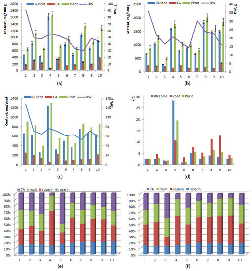 Concentrations of rosavins, cinnamyl alcohol, and phenylpropanoids in rhizomes (a), in roots (b), in the whole plant; (c) rosavins/cinnamyl alcohol ratio (x:1) (d) and a relative phenylpropanoid profile (%) of the rhizome (e) and root (f) of 6-year-old R. rosea plants cultivated in the forest–steppe zone of Western Siberia. The horizontal axis: plants (specimens) No. 1–10.