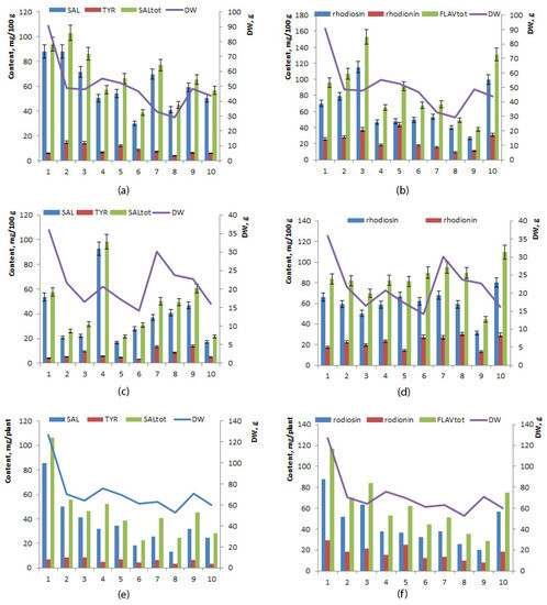 Concentrations of phenylethanoids (a,c,e), flavonoids (b,d,f), and growth parameters of 6-year-old R. rosea plants cultivated in the forest–steppe zone of Western Siberia: (a,b) in rhizomes, (c,d) in roots, (e,f) in the whole plant. The horizontal axis: specimens No. 1–10.