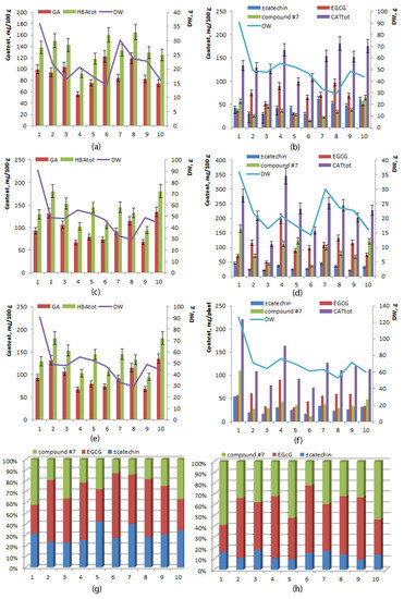 Concentrations of hydroxybenzoic acids (a,c,e) and catechins (b,d,f) in rhizomes (a,b), in roots (c,d), and in the whole plant (e,f); a relative catechin profile (%) of the rhizome (g) and root (h) of 6-year-old R. rosea plants cultivated in the forest–steppe zone of Western Siberia. The horizontal axis: plants (specimens) No. 1–10.