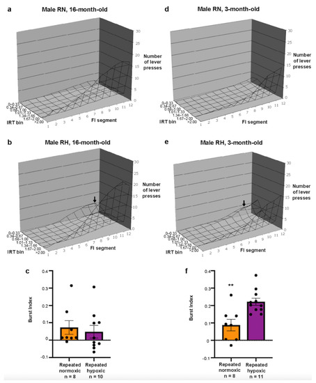 Measurement of impulsivity in male 16-month-old and 3-month-old rats. (a,b) Impulsivity data showing the incidence of different inter-response times (IRTs) between lever presses during each fixed interval (FI) task of two min for (a) repeated normoxia (RN) rats and (b) repeated hypoxia (RH) rats. These rats were tested from 16 months of age. IRTs were distributed into inter-response (IRT) bins of 0.33 s duration, spanning from 0 to >2 s. Each FI period of two min (120 s) was divided into 12 FI segments, each with a duration of 10 s. FI segment 1 is the first 10 s in each time period of 120 s, FI segment 2 is the second 10 s in each time period of 120 s, and so on. (a) versus (b), repeated measures ANOVA, p < 0.292. The arrow in (b) indicates a higher number of IRTs of 0–0.33 s duration compared to (a). (c) Burst index data for 16-month-old repeated normoxia and repeated hypoxia rats, two-tailed Student’s t-test, p = 0.654. (d,e) Data for impulsivity during FI testing for 3-month-old repeated normoxia (RN) rats (d) and repeated hypoxia (RH) rats (e), (d) versus (e), repeated measures ANOVA, p < 0.0001. The arrow in (e) indicates a significantly higher number of IRTs of 0–0.33 s duration compared to (d). (f) Burst index data for 3-month-old repeated normoxia and repeated hypoxia rats, two-tailed Student’s t-test, ** p < 0.01.