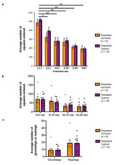 Open field behaviour in repeated normoxia and repeated hypoxia rats at different ages. (a) Average number of squares entered in each session of the open field test at postnatal day (PN) 113, 221, 457, and 538–540, * p < 0.05 versus PN113 for both groups, ** p < 0.01 versus PN113 for both groups, Bonferroni post-hoc analysis corrected for multiple comparisons. (b) Average number of squares entered within each 5 min period of a 20 min session of the open field test at PN540. (c) Average number of groomings or rearings in a 20 min session at PN540. Each circle is the number of squares entered (b) or groomings or rearings (c) achieved by an individual repeated normoxia rat and each square is the number achieved by an individual repeated hypoxia rat.
