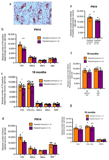 Absolute number of tyrosine hydroxylase (TH)-positive dopaminergic neurons and thionin-stained neurons in repeated normoxia and repeated hypoxia rats. (a) Immunostained TH-positive dopaminergic neurons in the VTA. Average absolute number of TH-positive dopaminergic neurons in each midbrain dopaminergic subregion at PN14 (b) and at 18 months of age (c). Average absolute number of thionin-stained neurons in each midbrain dopaminergic subregion at PN14 (d). Average combined (i.e., total) absolute number of TH-positive dopaminergic neurons in the midbrain at PN14 (e) and at 18 months of age (f). (g) Absolute number of thionin-stained neurons in the ventral tegmental area (VTA), VTA plus caudal linear nucleus (CLi), and the substantia nigra compacta dorsal tier (SNCd), at 18 months of age. * p ≤ 0.05, + p = 0.0561; ** p < 0.02, *** p < 0.001. RRF, retrorubral field; SNCv, substantia nigra compacta ventral tier.