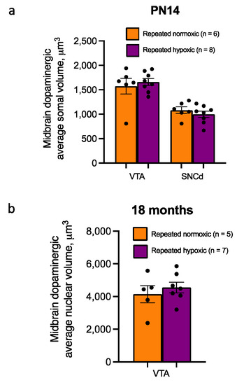 For the dopaminergic neurons in the VTA and SNCd, there was no significant difference in the average somal volume for the repeated hypoxia versus repeated normoxia rats at PN14 (VTA: repeated hypoxia, 1659 ± 76 µm3, repeated normoxia, 1574 ± 176 µm3, two-tailed Mann–Whitney U test, U = 24, p > 0.9999; SNCd: repeated hypoxia, 998 ± 69 µm3, repeated normoxia, 1083 ± 74 µm3, two-tailed Student’s t-test, t12 = 0.900, p = 0.3859, Figure 7a). At 18 months of age, there was no significant difference in the nuclear volume of dopaminergic neurons in the VTA (repeated hypoxia, 4547 ± 357 µm3, n = 7; repeated normoxia, 4145 ± 589 µm3, n = 5, two-tailed Student’s t-test, t10 = 0.682, p = 0.5108, Figure 7b).
