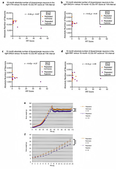 As indicated in the introduction, it is possible that the ADHD-like hyperactivity observed in repeated hypoxia rats at 16 months of age [20] and at 3 months of age (Figure 3) could be due to deficits in the midbrain dopaminergic system. It is unknown, however, whether the death of midbrain dopaminergic neurons could be a contributing factor to the development of ADHD-like hyperactivity. Thus, we stereologically measured the total (i.e., absolute) number of immunostained dopaminergic neurons in the right midbrain of 18-month-old rats (i.e., the cohort 1 rats) and in a new third cohort of PN14 repeated normoxia versus repeated hypoxia rats (Figure 1c). The PN14 cohort consisted of repeated hypoxia and repeated normoxia rats from two different litters.
