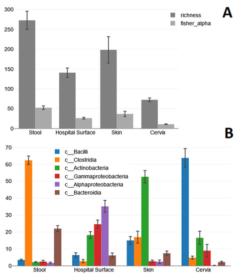 At the phylum-to-species level, all taxa with an average abundance of >0.5% were considered for the statistical analysis. These included 6 phyla, 9 classes, 25 orders, 35 families, 30 genera, and 9 species. The average richness and fisher-alpha diversity for each sample type are displayed in Figure 1A. The ANOVA showed that there were significant differences in regard to the variable richness (F = 27.53, p ≤ 0.001) and fisher-alpha diversity (F = 30.53, p ≤ 0.001). The Bonferroni post hoc test revealed that the pairwise group comparisons of Skin–Stool, Skin–Cervix, Hospital Surface–Stool, Hospital Surface–Cervix and Stool–Cervix have a p-value less than 0.05, both in regard to richness and fisher alpha diversity. Abundance of the six most prominent bacterial classes in different clinical sample types is displayed in Figure 1B.