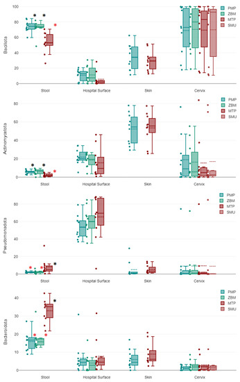 The ANOVA and post hoc tests revealed significantly more Bacilli (F = 65.41, p ≤ 0.001) in cervical swabs than in all other sample types (p < 0.05), more Clostridia (F = 225.56, p = ≤ 0.001) in stool than in all other samples (p < 0.05) and in skin than in cervical and hospital surface swabs (p < 0.05), more Actinobacteria (F = 37.2, p ≤ 0.001) in skin than in all other samples and in cervical and hospital surface swabs than in stool (p < 0.05), more Gamma- (F = 13.05, p ≤ 0.001) and Alphaproteobacteria (F = 88.32, p ≤ 0.001) in hospital surface swabs than in all other sample types (p < 0.05), and more Bacteroidia (F = 50.18, p ≤ 0.001) in stool than in all other samples (p < 0.05) and in skin than in cervical swabs (p < 0.05).