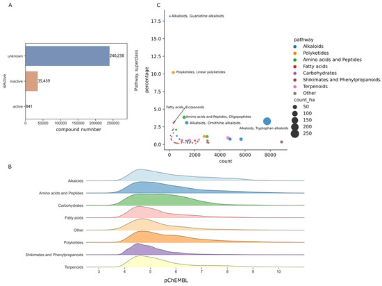 We then used the activity data with “single protein” and counted the number of highly active substances in each superclass of natural product (pChEMBL > 8). We counted the percentage of high activities of natural products based on the total number in each pathway category. As shown in Figure 3C, guanidine and linear polyketide had significantly higher hit rates (18.18% and 10.20%) than the other categories. Natural products originating from the pathways of amino acids, fatty acids and phenylpropanoids had a higher hit rate of more than 1.0%.
