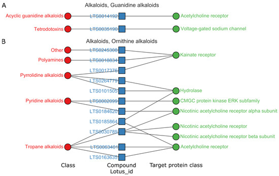 Relations among targets, compounds and natural product class of guanidine (A) and ornithine (B), pChEMBL > 8, target protein class levels (≥2). Full data associated can be found in datasheet S2 in Supplementary Materials.