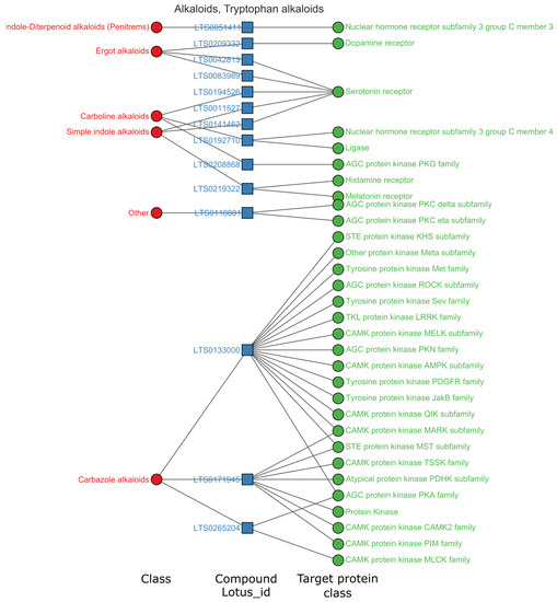 Tryptophan alkaloids also acted on the nervous system with unique targeting features. According to the data of high activity related tryptophan alkaloids class (datasheet S2 in Supplementary Materials), there were 254 activity entries covering 14 natural chemical classes, 45 compounds, and 172 targets. The biotargets belong to 87 protein classes. As shown in Figure 5, the primary targets were the serotonin receptor (41 entries), adrenergic receptor (21 entries), and dopamine receptor (10 entries). It was obvious that serotonin and adrenergic receptors were the two main target classes for tryptophan alkaloids. The natural ligands for serotonin receptors were primarily ergot alkaloids (24 entries, 7 compounds) and simple indole alkaloids (14 entries, 4 compounds). The compound class targeting adrenergic receptors were mainly ergot alkaloids (14 entries), yohimbine-like alkaloids (5 entries), and phenylalanine-derived alkaloids (2 entries). Network diagrams can show correlations between different data sets but are limited in the data items they can present. To present the most strongly active pattern, we selected entries with pChEMBL > 9. Figure 5 shows 14 tryptophan alkaloids in indole diterpenoid, ergot, carboline, simple indole and carbazole classes. The compound LTS0133000 and LTS0171945 had more targets than other alkaloids. LTS0133000 had been recorded with 15 target families (pChEMBL > 9), mainly acting on tyrosine protein kinase families and other protein kinases. LTS0171945 (staurosporine) had 7 target families, primarily acting on CAMK protein kinases. In superclass tryptophan, compound LTS0265204 has the highest affinity to the α-catalytic subunit of cAMP-dependent protein kinase according to ChEMBL records.